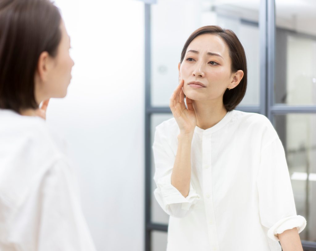 2つ目は、表情筋の衰えです。頬を支える筋肉が弱まることで、皮膚がたるみ、ほうれい線が目立つようになります。